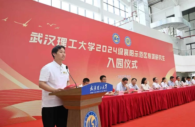襄阳达安汽车检测中心有限公司王希诚副总经理、学校化学化工与生命科学学院雷志鑫教授、材料学院2024级研究生汪新杰分别代表合作企业、导师、首届专项研究生在入园仪式上发言。
